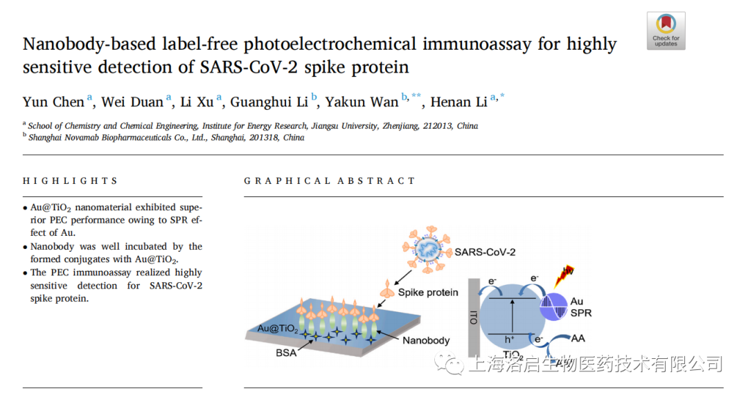2022年5月3日,华宇拍卖app下载生物和江苏大学化学化工学院李赫楠教授团队合作,在《Analytica Chimica Acta》发表了题为“Nanobody-based label-free photoelectrochemical immunoassay for highly sensitive detection of SARS-CoV-2 spike protein”的研究论文。华宇拍卖app下载生物万亚坤博士和李贺楠教授为并列通讯作者,相关纳米抗体的知识产权归华宇拍卖app下载生物所有。