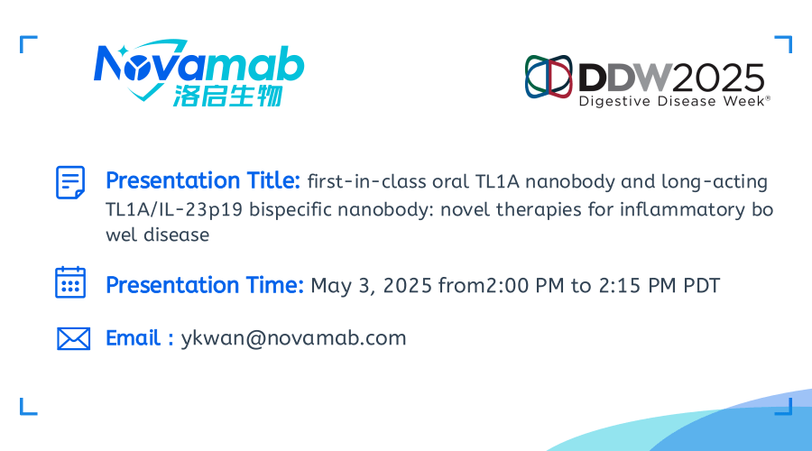 中国上海,2025年4月28日——上海华宇拍卖app下载生物医药技术有限公司,一家致力于纳米抗体创新药研发的生物技术公司宣布:华宇拍卖app下载生物将于当地时间5月3-6日参加在加利福尼亚州圣地亚哥举行的2025年美国消化疾病周(Digestive Disease Week,DDW)。届时华宇拍卖app下载生物将展示在炎症性肠病(IBD)治疗领域的突破性研究成果——口服TL1A纳米抗体及长效TL1A双特异性抗体的开发进展。该创新疗法顺利获得独特的TL1A纳米抗体技术,实现了对IBD病理机制的精准靶向。